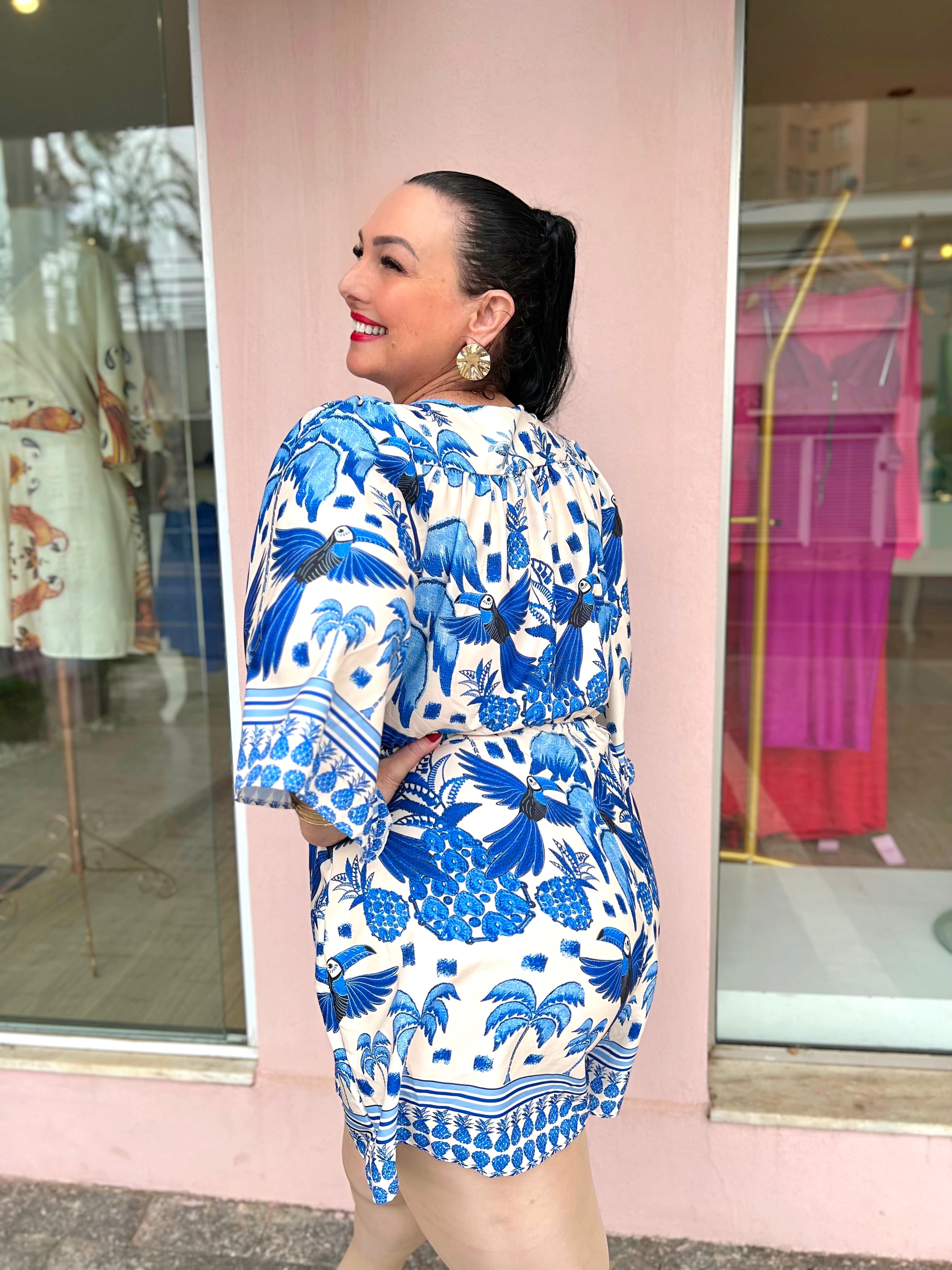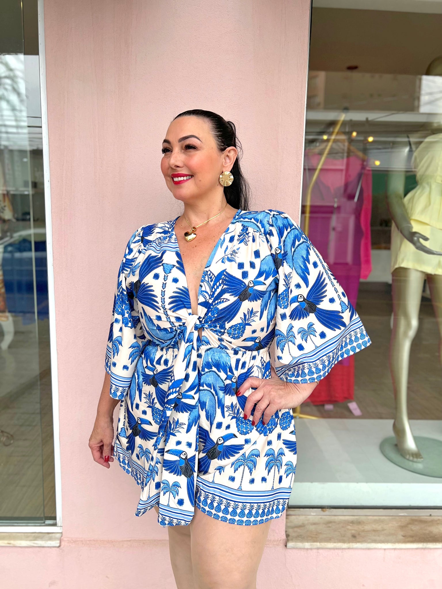 Um look prático e cheio de estilo! Esse macaquinho conta com detalhe de nó na parte da frente, que valoriza a cintura e traz um charme extra à peça. A estampa é alegre e moderna, perfeita para dias ensolarados e ocasiões descontraídas. Confortável e versátil, veste bem do tamanho 44 ao 48, garantindo caimento leve e cheio de movimento.