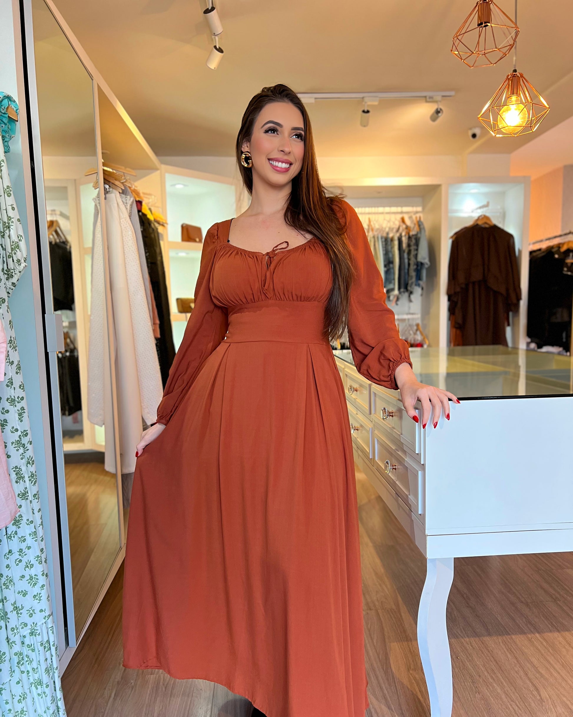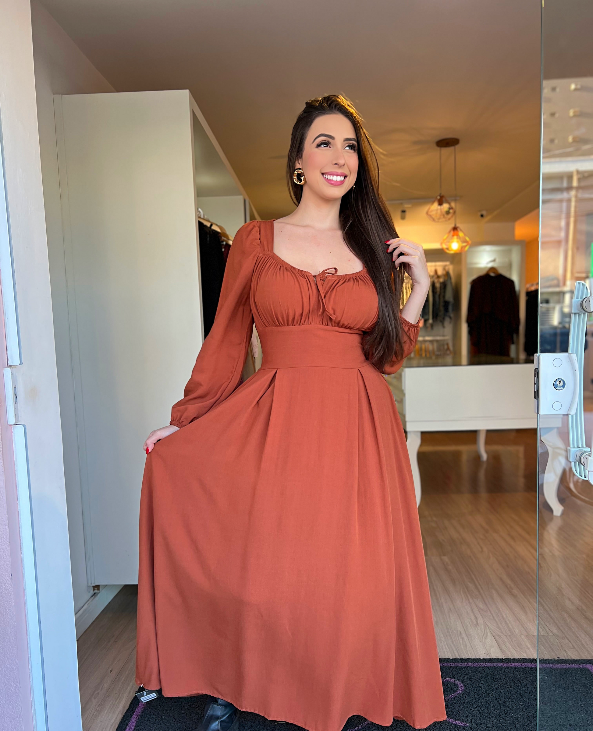 Leve, elegante e super democrático! Esse vestido longo é confeccionado em viscolinho — um tecido leve, fresco e com toque natural — perfeito para todas as estações. Ele possui bojo embutido, garantindo mais conforto e sustentação, além de mangas longas que trazem sofisticação e delicadeza ao look. O caimento é incrível e, graças ao corte e à modelagem, ele veste do tamanho P até o G/GG com muita elegância. Ideal para quem busca uma peça versátil, estilosa e que valoriza diferentes corpos!
